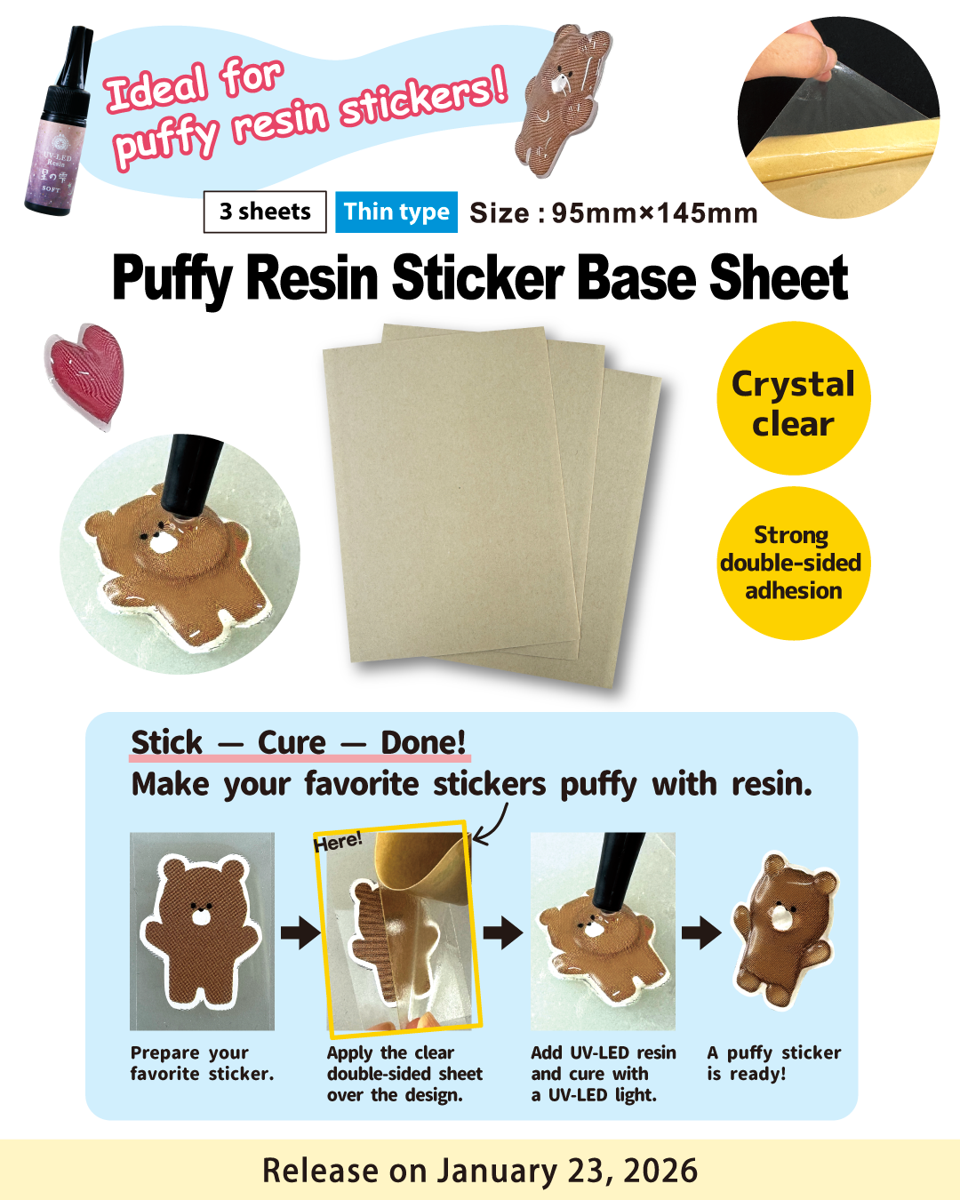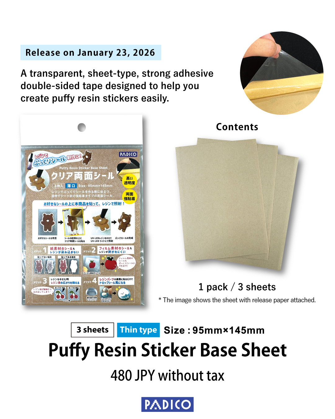 To make these trendy, domed stickers even easier to create, we're introducing a new product: Puffy Resin Sticker Base Sheet, a clear, sheet-type, double sided adhesive with strong tack -- perfect for making puffy resin stickers.