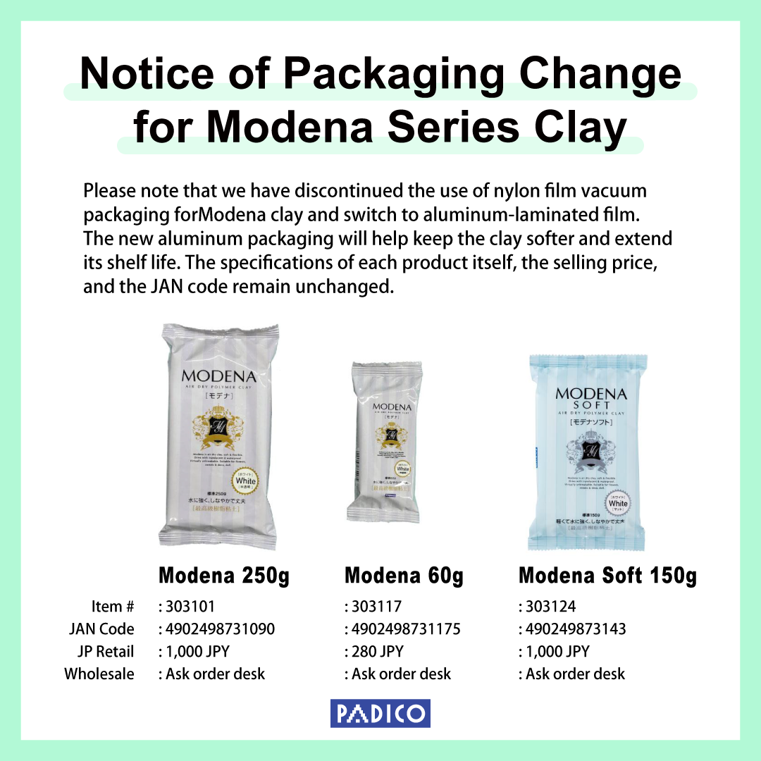Please note that we have discontinued the use of nylon film vacuum packaging for Modena clay and switch to aluminum-laminated film. The new packaging style has been in active since the beginning of this month. All Modena for international destinations will be the clay packaging with the aluminum bags from now on.