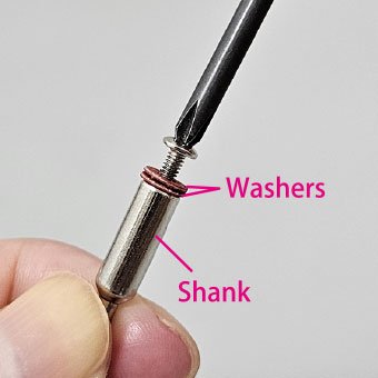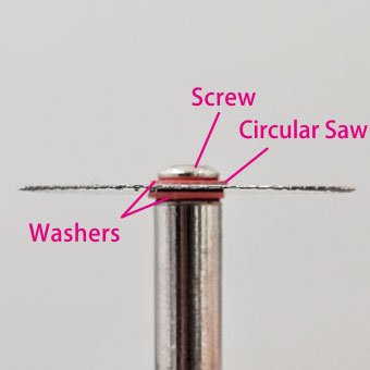 Place the circular saw blade between the two washers. Insert the screw through the washers and blade, attach it to the shank, and tighten securely.