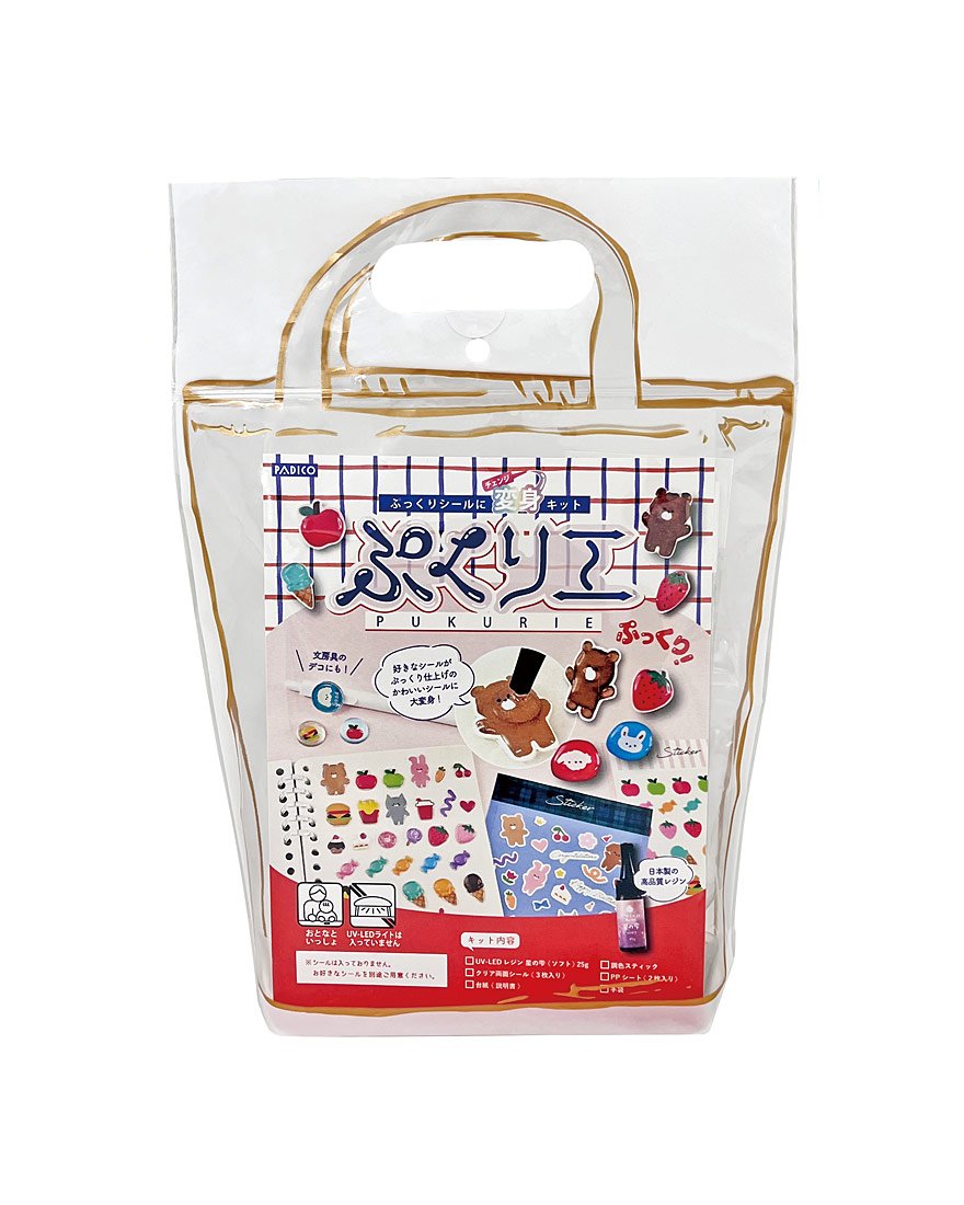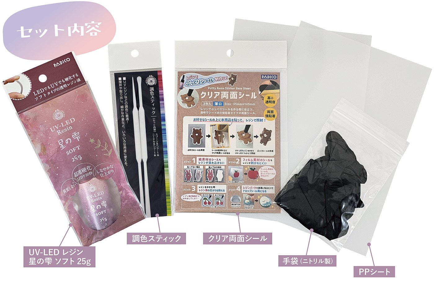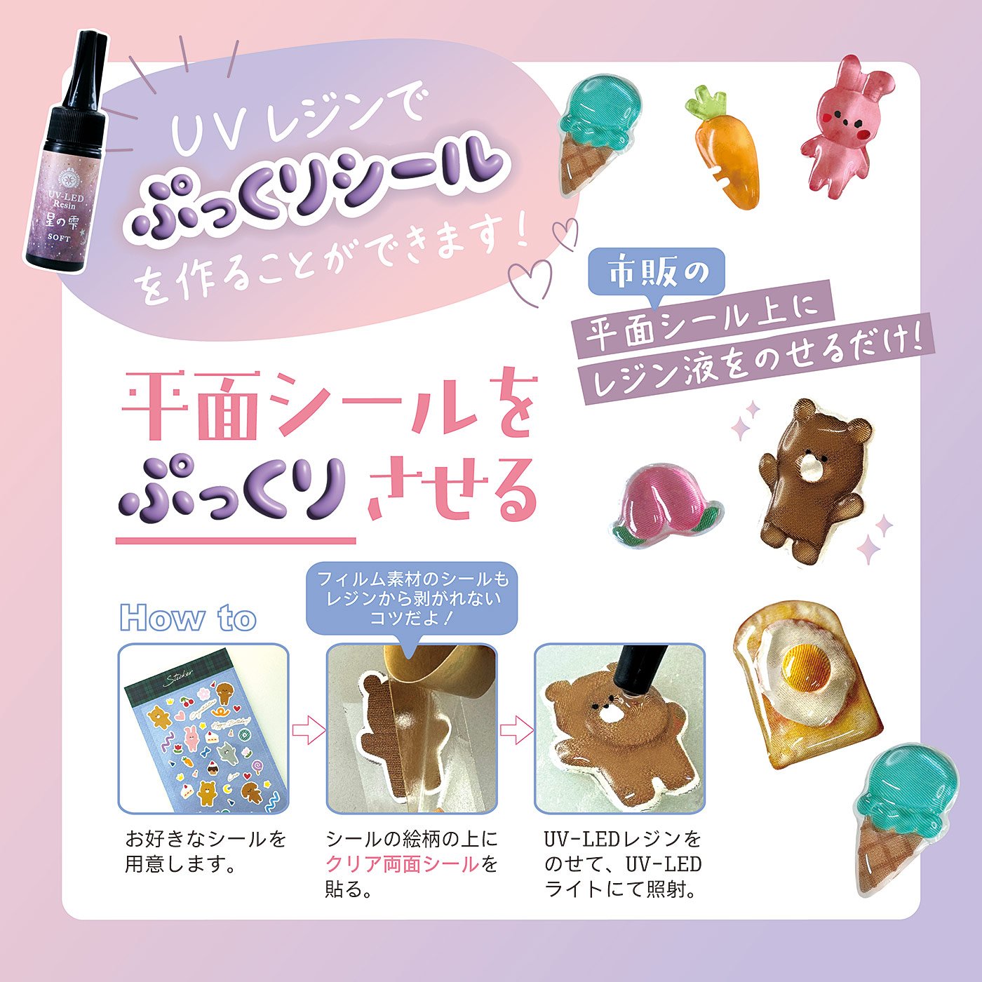 お好きなシールをUV-LEDレジンでぷっくりシールに変身させることができるキットです。