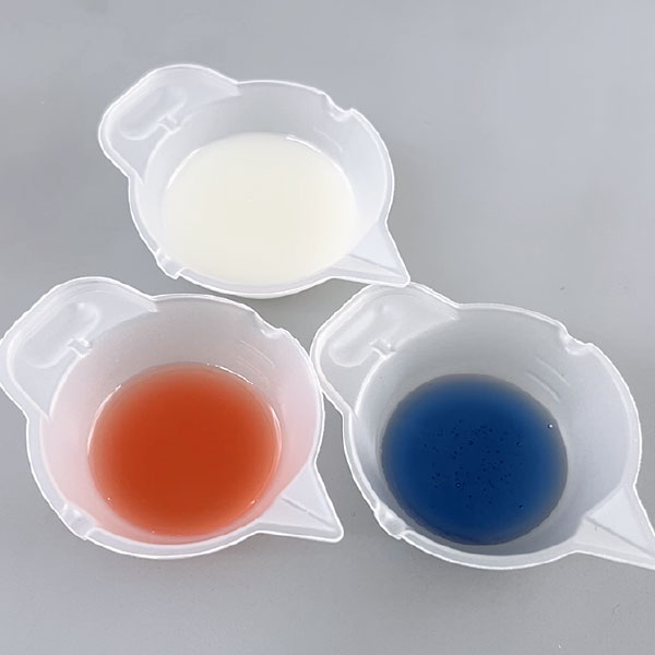 調色パレット3個にUV-LEDレジン空の雫と〈はくちょう座〉の3色を入れて、調色スティックでムラがなくなるまでよく混ぜ、3色のレジンを作ります。