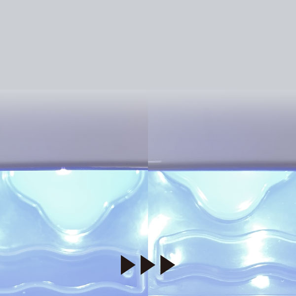 UV-LEDライトを1分照射し、モールドを裏返して更に1分照射します。軽く触ってみて、ベトつきがあれば追加で30秒照射します。
