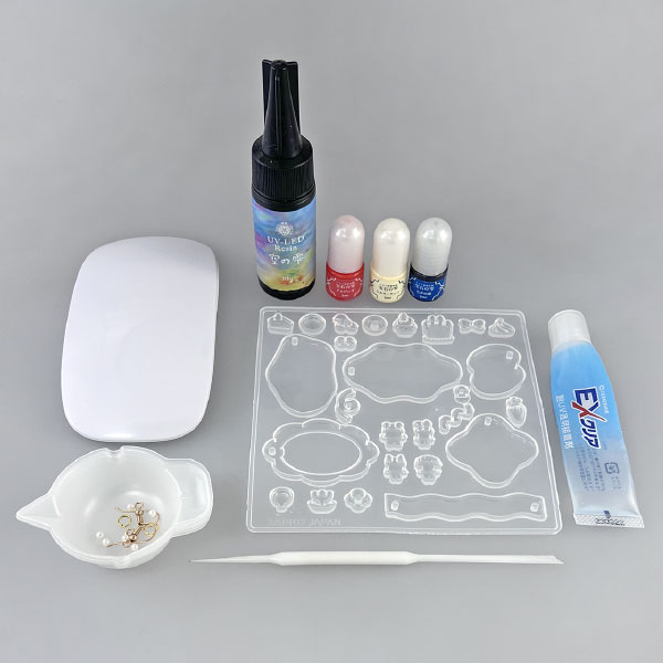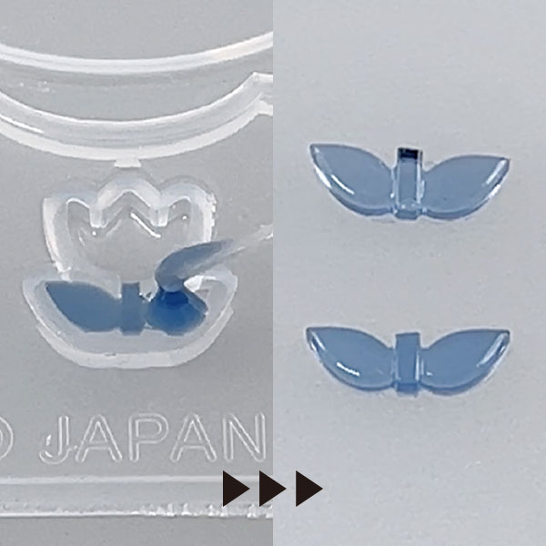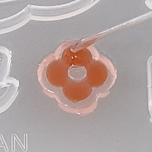 モールドのフラワーに〈アルビレオ〉色のレジンを入れ、ライトを両面1分ずつ照射し、モールドから抜きます。