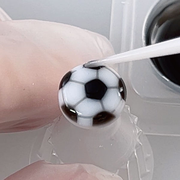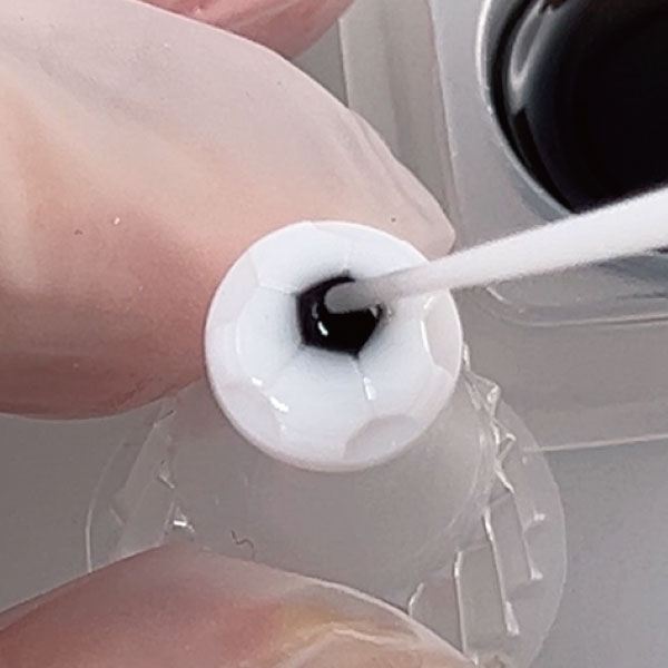 ポンポンスタンドにボールのパーツを乗せ、模様部分に黒のレジンを入れます。