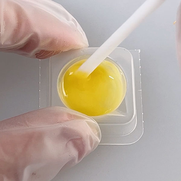 調色パレット〈miniサイズ〉にレジンと宝石の雫〈イエロー1滴+ホワイト1滴〉を入れて、調色スティックでよく混ぜます。