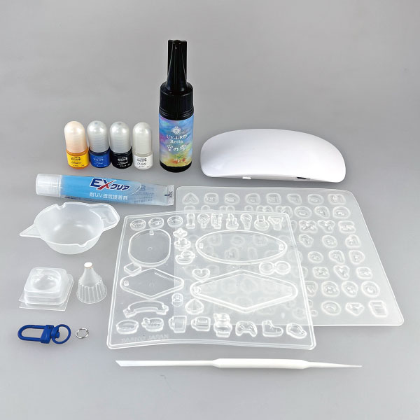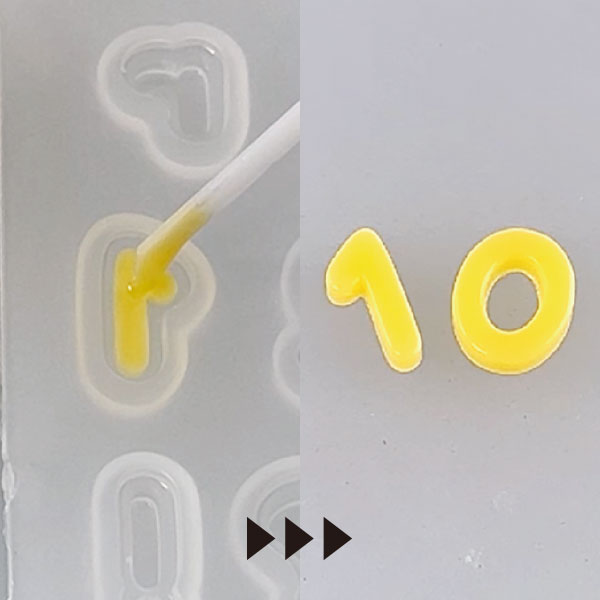 モールドの数字の一層目に入れ、ライトを両面1分ずつ照射してモールドから抜きます。(2色にする場合は一層目を硬化後、二層目に違う色を入れて硬化。)