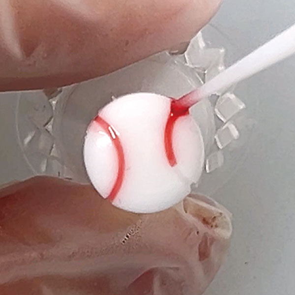 バスケットボール、野球ボールは線の溝のフチから少しずつレジンを流して模様にして、ライトを2分照射して硬化させます。